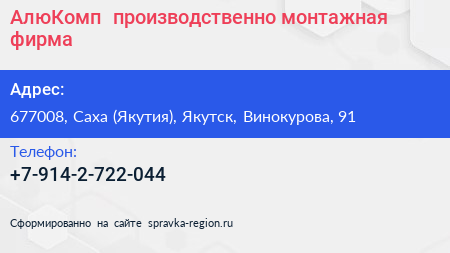 АлюКомп+, производственно-монтажная фирма по адресу 677008, Саха (Якутия), Якутск, Винокурова, 91 в дальнейшем Организация, размещена в следующих категориях:
