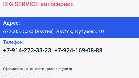 BIG SERVICE, автосервис по адресу 677005, Саха (Якутия), Якутск, Кутузова, 10 в дальнейшем Организация, размещена в следующих категориях: