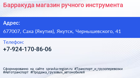 Барракуда, магазин ручного инструмента по адресу 677007, Саха (Якутия), Якутск, Чернышевского, 41 в дальнейшем Организация, размещена в следующих категориях: