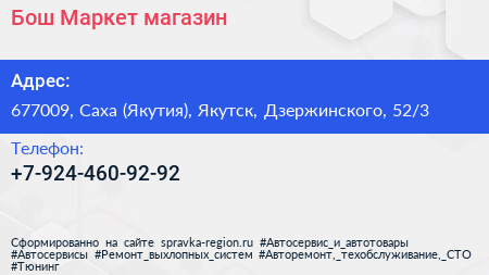Бош Маркет, магазин по адресу 677009, Саха (Якутия), Якутск, Дзержинского, 52/3 в дальнейшем Организация, размещена в следующих категориях: