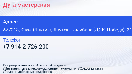 Дуга, мастерская по адресу 677013, Саха (Якутия), Якутск, Билибина (ДСК Победа), 21 в дальнейшем Организация, размещена в следующих категориях: