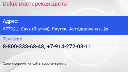 Dulux, мастерская цвета по адресу 677021, Саха (Якутия), Якутск, Автодорожная, 2в в дальнейшем Организация, размещена в следующих категориях: