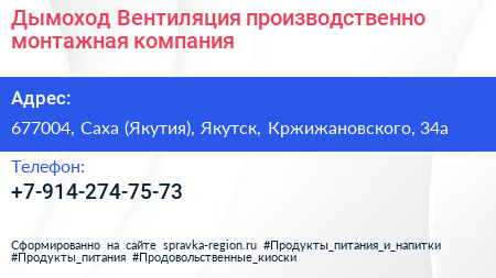 Дымоход & Вентиляция, производственно-монтажная компания по адресу 677004, Саха (Якутия), Якутск, Кржижановского, 34а в дальнейшем Организация, размещена в следующих категориях: