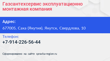 Газсантехсервис, эксплуатационно-монтажная компания по адресу 677005, Саха (Якутия), Якутск, Свердлова, 10 в дальнейшем Организация, размещена в следующих категориях: