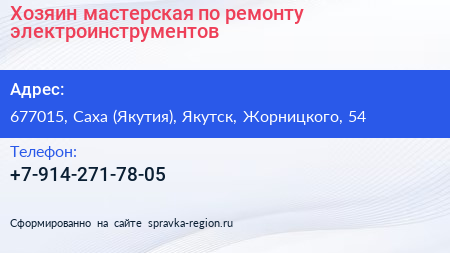 Хозяин, мастерская по ремонту электроинструментов по адресу 677015, Саха (Якутия), Якутск, Жорницкого, 54 в дальнейшем Организация, размещена в следующих категориях: