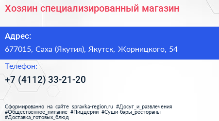 Хозяин, специализированный магазин по адресу 677015, Саха (Якутия), Якутск, Жорницкого, 54 в дальнейшем Организация, размещена в следующих категориях: