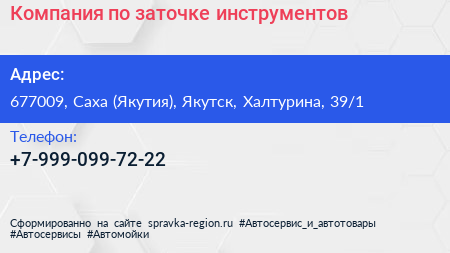 Компания по заточке инструментов по адресу 677009, Саха (Якутия), Якутск, Халтурина, 39/1 в дальнейшем Организация, размещена в следующих категориях: