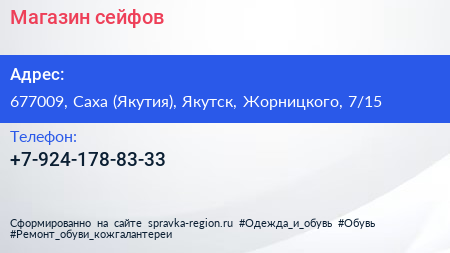 Магазин сейфов по адресу 677009, Саха (Якутия), Якутск, Жорницкого, 7/15 в дальнейшем Организация, размещена в следующих категориях: