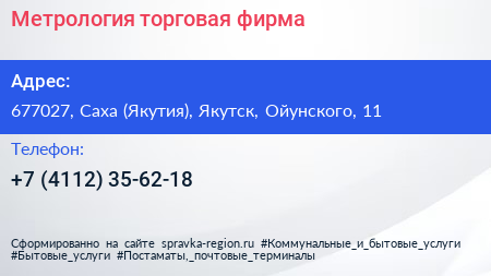 Метрология, торговая фирма по адресу 677027, Саха (Якутия), Якутск, Ойунского, 11 в дальнейшем Организация, размещена в следующих категориях: