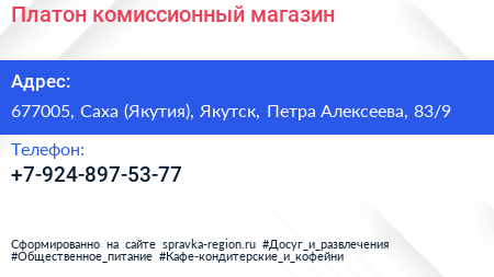 Платон, комиссионный магазин по адресу 677005, Саха (Якутия), Якутск, Петра Алексеева, 83/9 в дальнейшем Организация, размещена в следующих категориях: