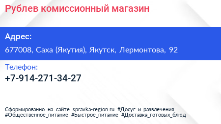 Рублев, комиссионный магазин по адресу 677008, Саха (Якутия), Якутск, Лермонтова, 92 в дальнейшем Организация, размещена в следующих категориях: