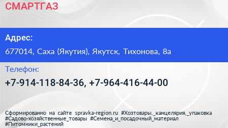 СМАРТГАЗ по адресу 677014, Саха (Якутия), Якутск, Тихонова, 8а в дальнейшем Организация, размещена в следующих категориях: