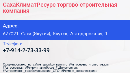СахаКлиматРесурс, торгово-строительная компания по адресу 677021, Саха (Якутия), Якутск, Автодорожная, 1 в дальнейшем Организация, размещена в следующих категориях: