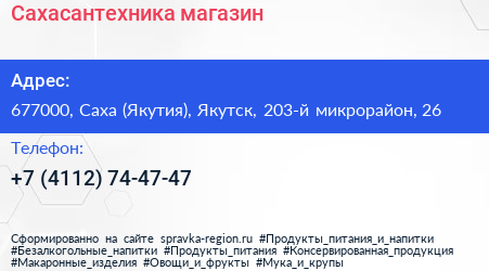 Сахасантехника, магазин по адресу 677000, Саха (Якутия), Якутск, 203-й микрорайон, 26 в дальнейшем Организация, размещена в следующих категориях: