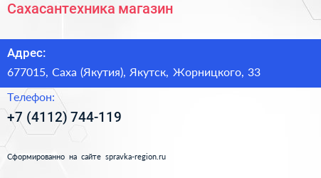 Сахасантехника, магазин по адресу 677015, Саха (Якутия), Якутск, Жорницкого, 33 в дальнейшем Организация, размещена в следующих категориях: