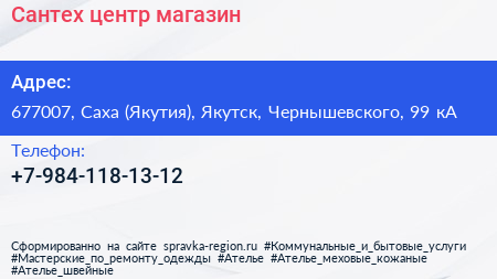 Сантех центр, магазин по адресу 677007, Саха (Якутия), Якутск, Чернышевского, 99 кА в дальнейшем Организация, размещена в следующих категориях: