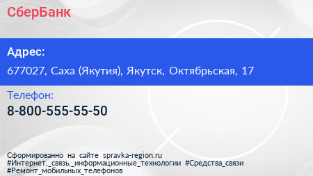 СберБанк по адресу 677027, Саха (Якутия), Якутск, Октябрьская, 17 в дальнейшем Организация, размещена в следующих категориях: