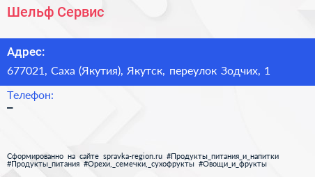 Шельф-Сервис по адресу 677021, Саха (Якутия), Якутск, переулок Зодчих, 1 в дальнейшем Организация, размещена в следующих категориях: