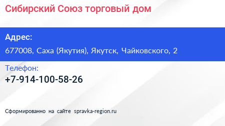 Сибирский Союз, торговый дом по адресу 677008, Саха (Якутия), Якутск, Чайковского, 2 в дальнейшем Организация, размещена в следующих категориях: