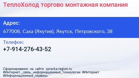 ТеплоХолод, торгово-монтажная компания по адресу 677008, Саха (Якутия), Якутск, Петровского, 38 в дальнейшем Организация, размещена в следующих категориях: