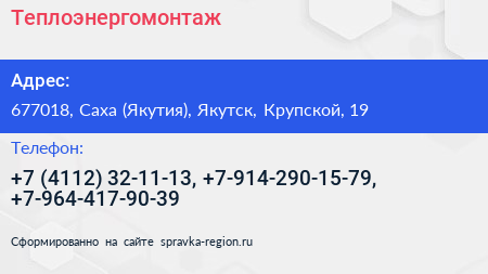Теплоэнергомонтаж по адресу 677018, Саха (Якутия), Якутск, Крупской, 19 в дальнейшем Организация, размещена в следующих категориях: