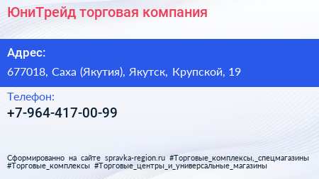ЮниТрейд, торговая компания по адресу 677018, Саха (Якутия), Якутск, Крупской, 19 в дальнейшем Организация, размещена в следующих категориях: