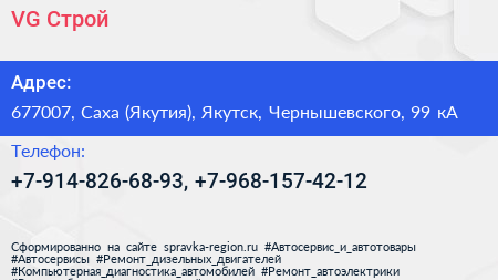 VG Строй по адресу 677007, Саха (Якутия), Якутск, Чернышевского, 99 кА в дальнейшем Организация, размещена в следующих категориях: