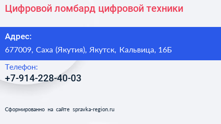 Цифровой, ломбард цифровой техники по адресу 677009, Саха (Якутия), Якутск, Кальвица, 16Б в дальнейшем Организация, размещена в следующих категориях: