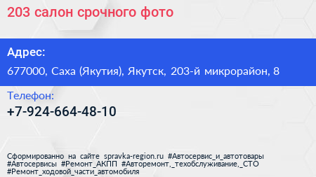 203, салон срочного фото по адресу 677000, Саха (Якутия), Якутск, 203-й микрорайон, 8 в дальнейшем Организация, размещена в следующих категориях: