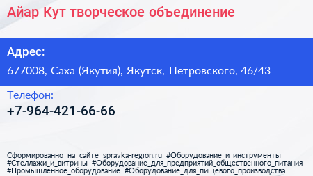 Айар Кут, творческое объединение по адресу 677008, Саха (Якутия), Якутск, Петровского, 46/43 в дальнейшем Организация, размещена в следующих категориях: