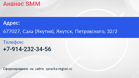 Ананас SMM по адресу 677027, Саха (Якутия), Якутск, Петровского, 32/2 в дальнейшем Организация, размещена в следующих категориях:
