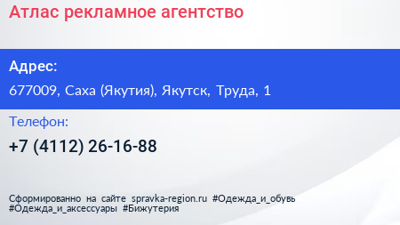 Атлас, рекламное агентство по адресу 677009, Саха (Якутия), Якутск, Труда, 1 в дальнейшем Организация, размещена в следующих категориях:
