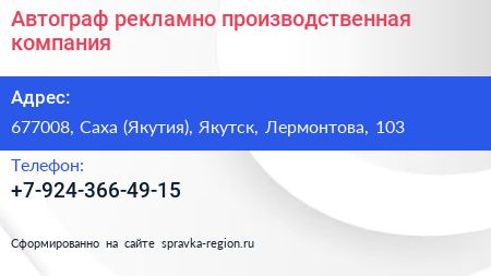 Автограф, рекламно-производственная компания по адресу 677008, Саха (Якутия), Якутск, Лермонтова, 103 в дальнейшем Организация, размещена в следующих категориях: