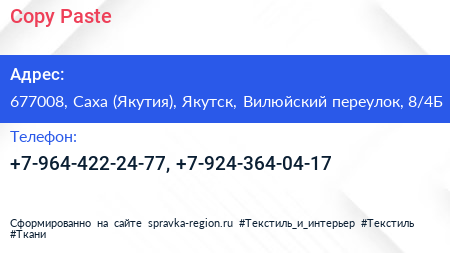 Copy Paste по адресу 677008, Саха (Якутия), Якутск, Вилюйский переулок, 8/4Б в дальнейшем Организация, размещена в следующих категориях: