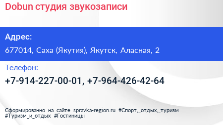 Dobun, студия звукозаписи по адресу 677014, Саха (Якутия), Якутск, Аласная, 2 в дальнейшем Организация, размещена в следующих категориях:
