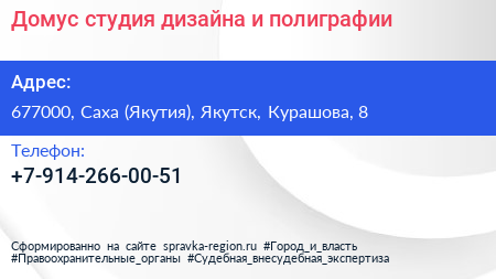 Домус, студия дизайна и полиграфии по адресу 677000, Саха (Якутия), Якутск, Курашова, 8 в дальнейшем Организация, размещена в следующих категориях: