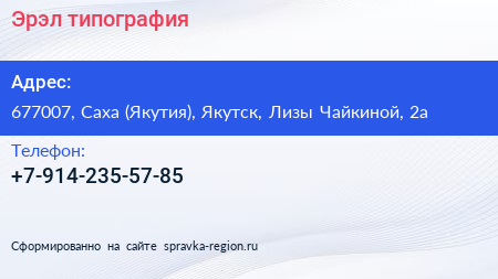 Эрэл, типография по адресу 677007, Саха (Якутия), Якутск, Лизы Чайкиной, 2а в дальнейшем Организация, размещена в следующих категориях: