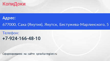 КопиДоки по адресу 677000, Саха (Якутия), Якутск, Бестужева-Марлинского, 5 в дальнейшем Организация, размещена в следующих категориях: