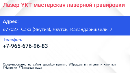 Лазер YKT, мастерская лазерной гравировки по адресу 677027, Саха (Якутия), Якутск, Каландаришвили, 7 в дальнейшем Организация, размещена в следующих категориях: