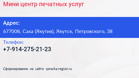 Мини-центр печатных услуг по адресу 677008, Саха (Якутия), Якутск, Петровского, 38 в дальнейшем Организация, размещена в следующих категориях: