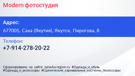 Modern, фотостудия по адресу 677005, Саха (Якутия), Якутск, Пирогова, 8 в дальнейшем Организация, размещена в следующих категориях: