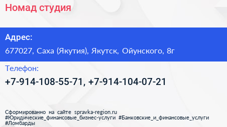 Номад, студия по адресу 677027, Саха (Якутия), Якутск, Ойунского, 8г в дальнейшем Организация, размещена в следующих категориях: