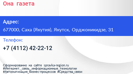 Она+, газета по адресу 677000, Саха (Якутия), Якутск, Орджоникидзе, 31 в дальнейшем Организация, размещена в следующих категориях:
