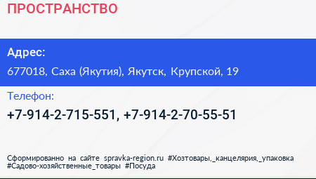 ПРОСТРАНСТВО по адресу 677018, Саха (Якутия), Якутск, Крупской, 19 в дальнейшем Организация, размещена в следующих категориях: