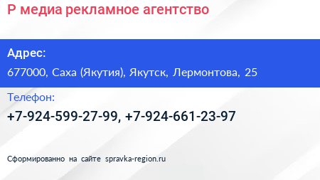 Р-медиа, рекламное агентство по адресу 677000, Саха (Якутия), Якутск, Лермонтова, 25 в дальнейшем Организация, размещена в следующих категориях:
