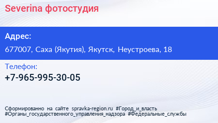Severina, фотостудия по адресу 677007, Саха (Якутия), Якутск, Неустроева, 18 в дальнейшем Организация, размещена в следующих категориях: