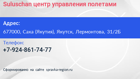 Suluschan, центр управления полетами по адресу 677000, Саха (Якутия), Якутск, Лермонтова, 31/2Б в дальнейшем Организация, размещена в следующих категориях: