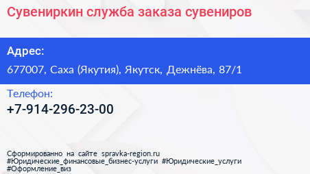 Сувениркин, служба заказа сувениров по адресу 677007, Саха (Якутия), Якутск, Дежнёва, 87/1 в дальнейшем Организация, размещена в следующих категориях: