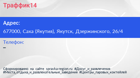 Траффик14 по адресу 677000, Саха (Якутия), Якутск, Дзержинского, 26/4 в дальнейшем Организация, размещена в следующих категориях:
