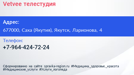 Vetvee, телестудия по адресу 677000, Саха (Якутия), Якутск, Ларионова, 4 в дальнейшем Организация, размещена в следующих категориях:
